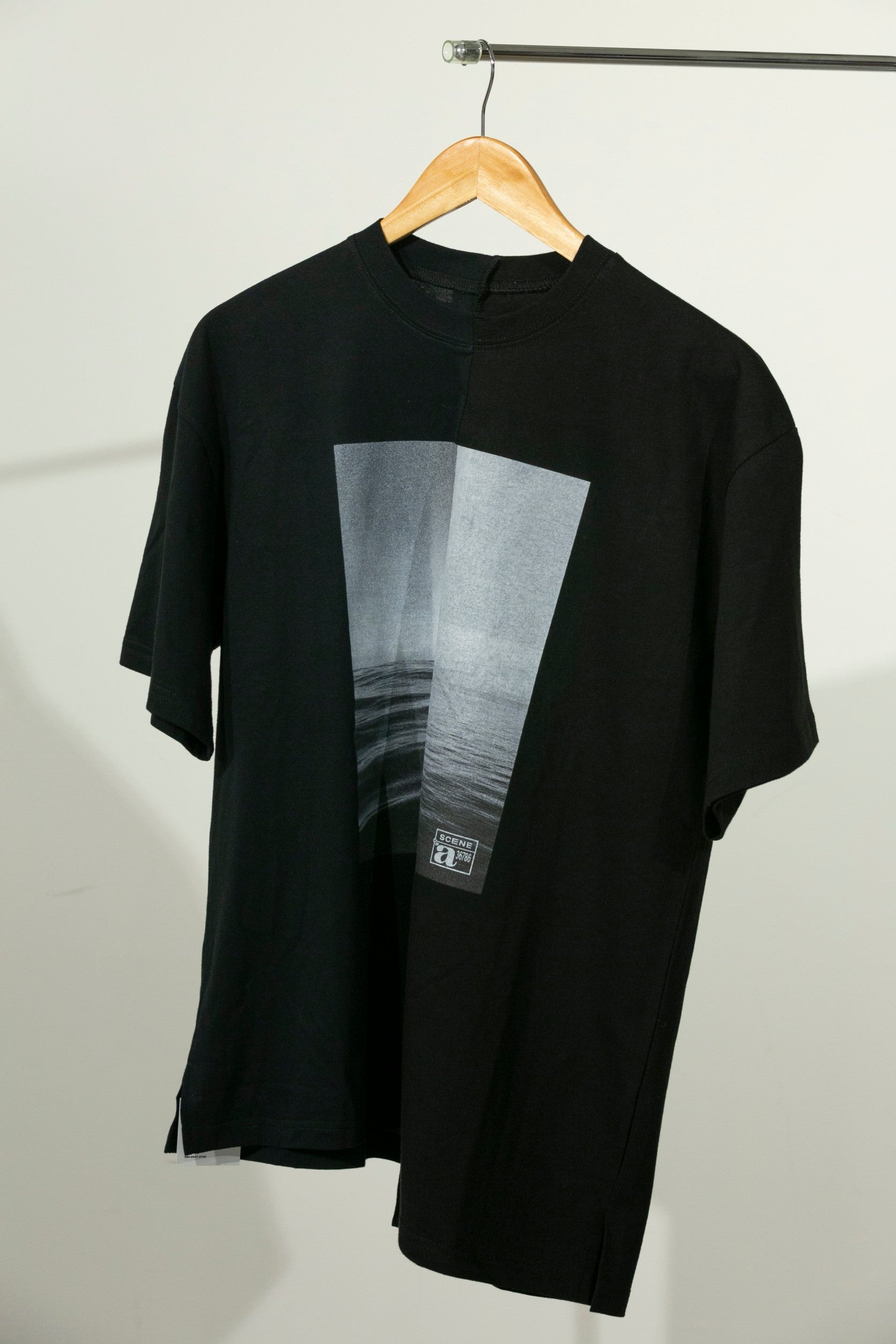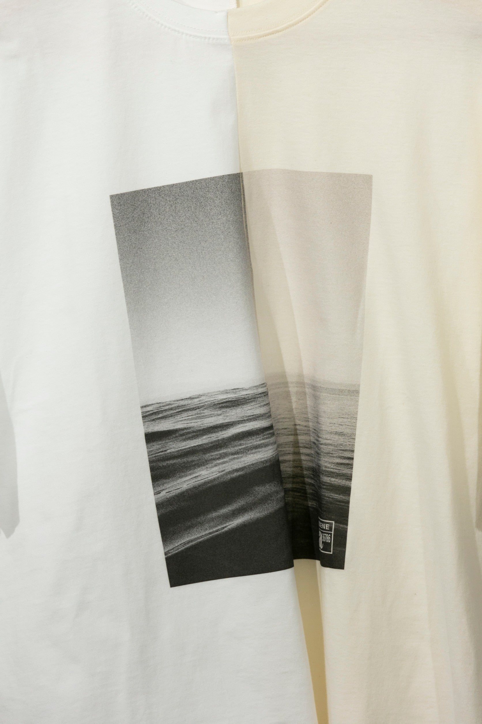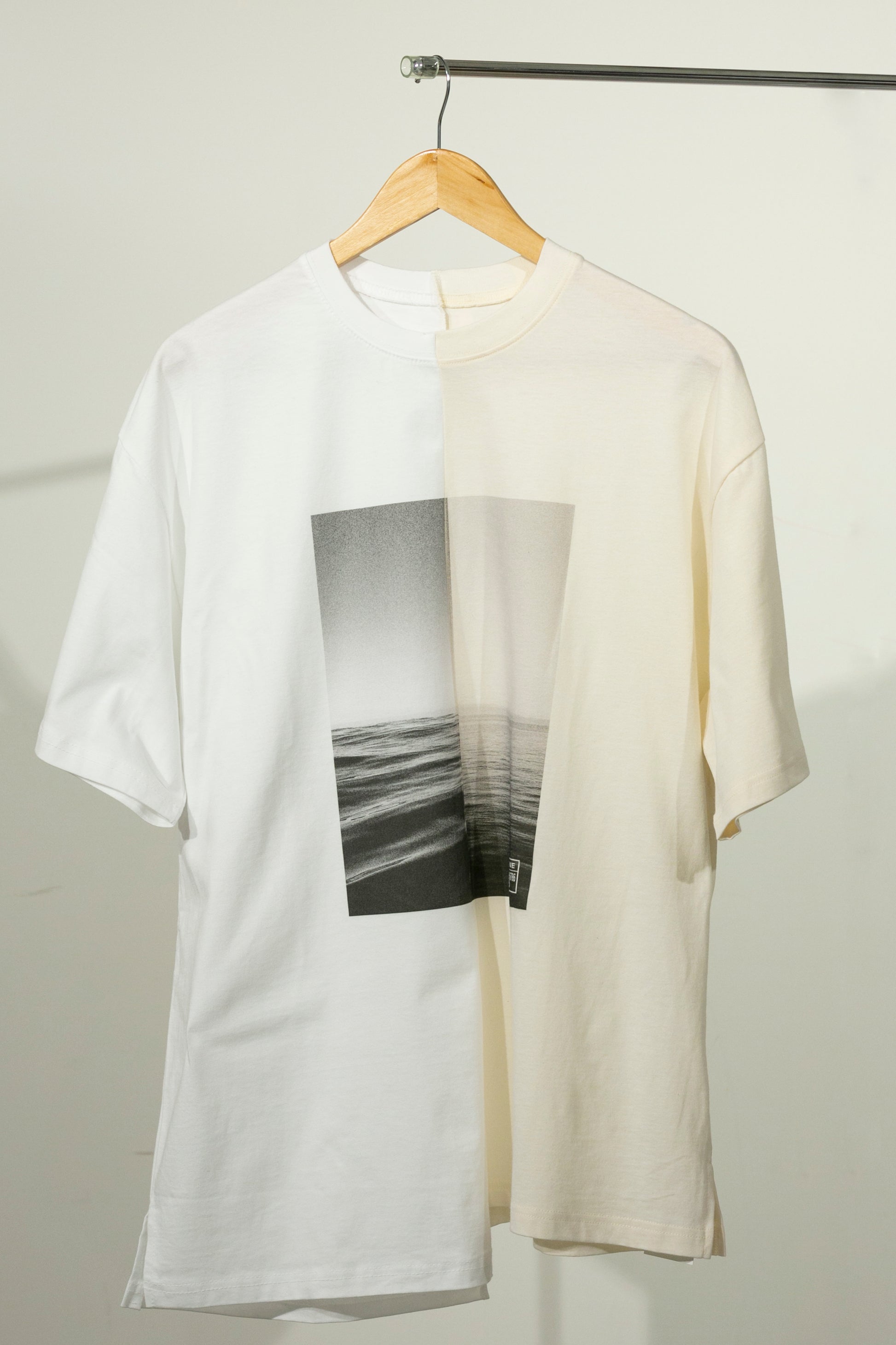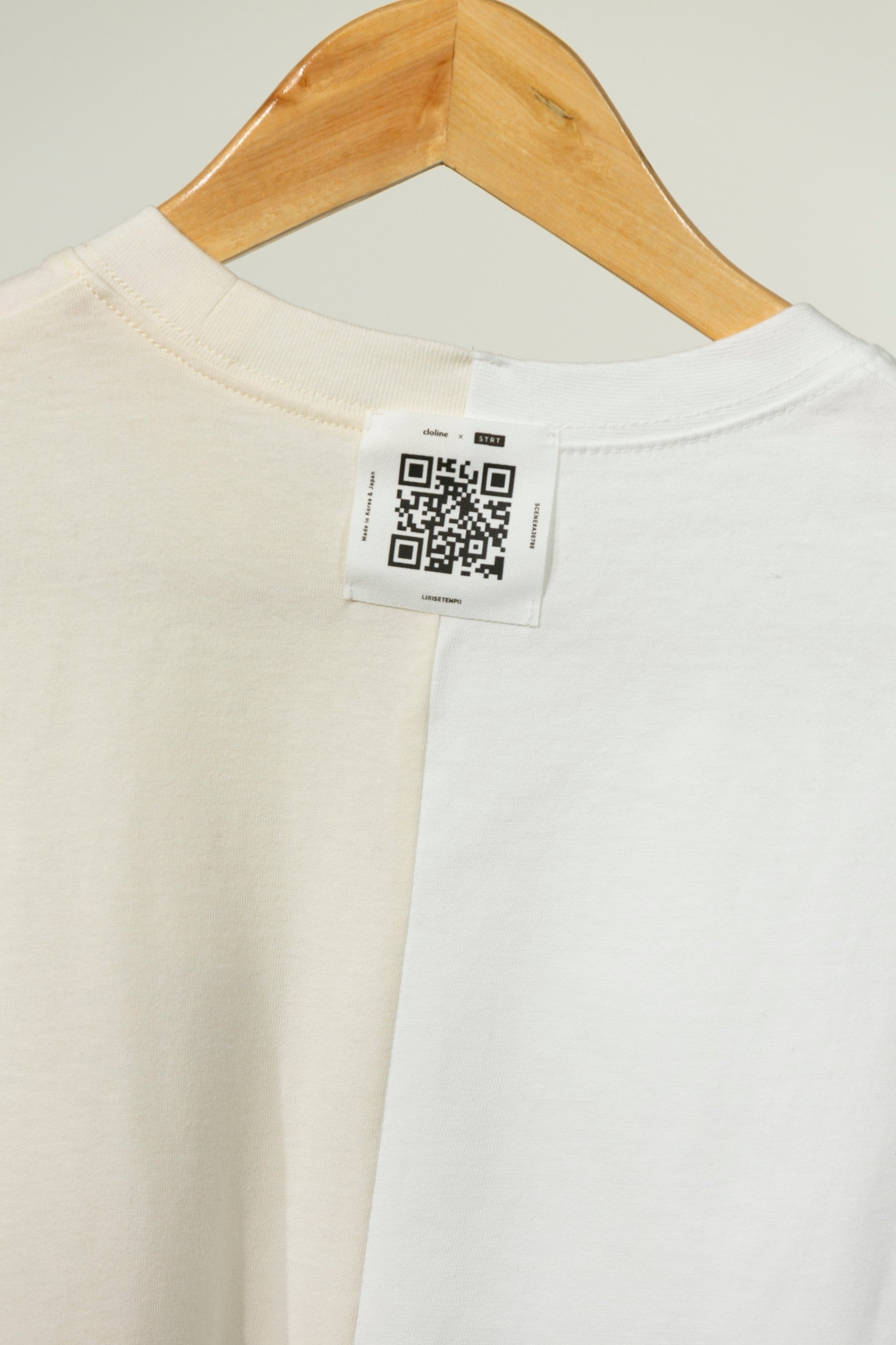 中央に切り替えしがあるデザインになっており、片側は韓国でつくられた「MADE IN KOREA」、もう片側は日本でつくられた「MADE IN JAPAN」のハーフ&ハーフTシャツです。