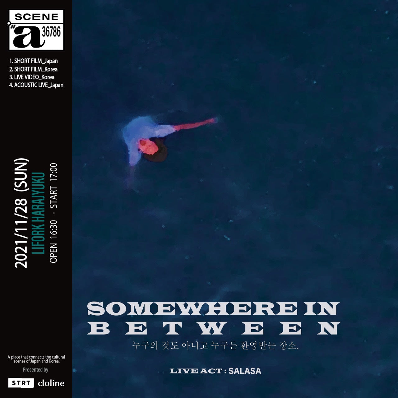 日本と韓国の共通点を、SOMEWHERE IN BETWEENのキーワードでもある「海」のグラフィックと、中央の切り替えしのデザインで表現しています。